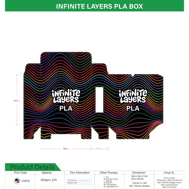 A: I design multiple categories — from retail boxes and food packaging to cosmetic, electronics, and gift boxes — all with custom dieline layouts.
